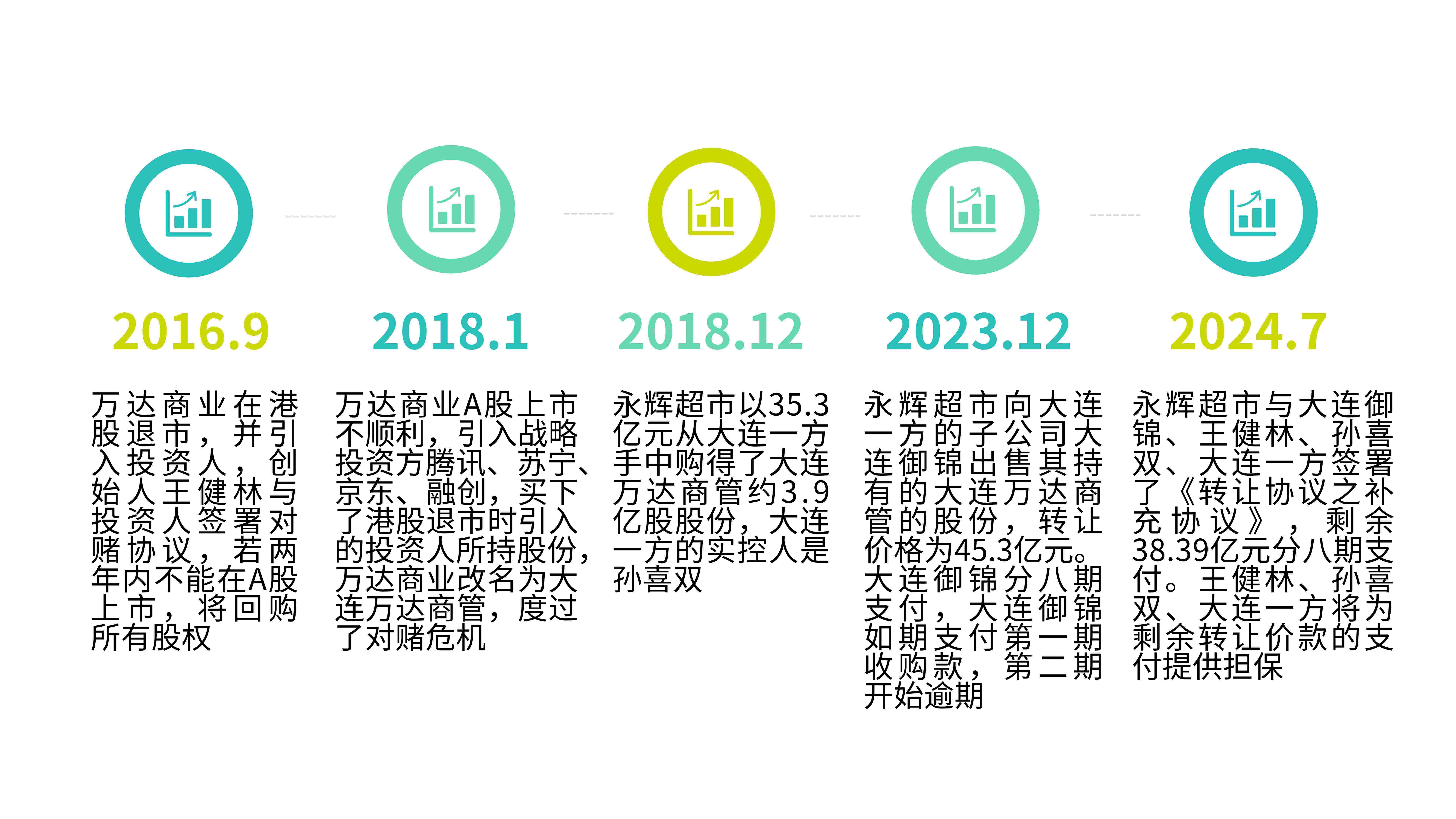 10月10日,永辉超市公告称,因“大连御锦”未在约定时间内支付“万达商管”第四期股权转让款,要求对方立即付款,并追究大连御锦、王健林、孙喜双、大连一方集团有限公司的法律责任。相关资料显示,剩余股份转让价款、加速到期违约金及律师费合计达38.59亿元。10月22日,苏宁易购发布关于重大仲裁的公告,请求裁决大连万达集团股份有限公司及其子公司万达商管支付股份回购款人民币50.41亿元。