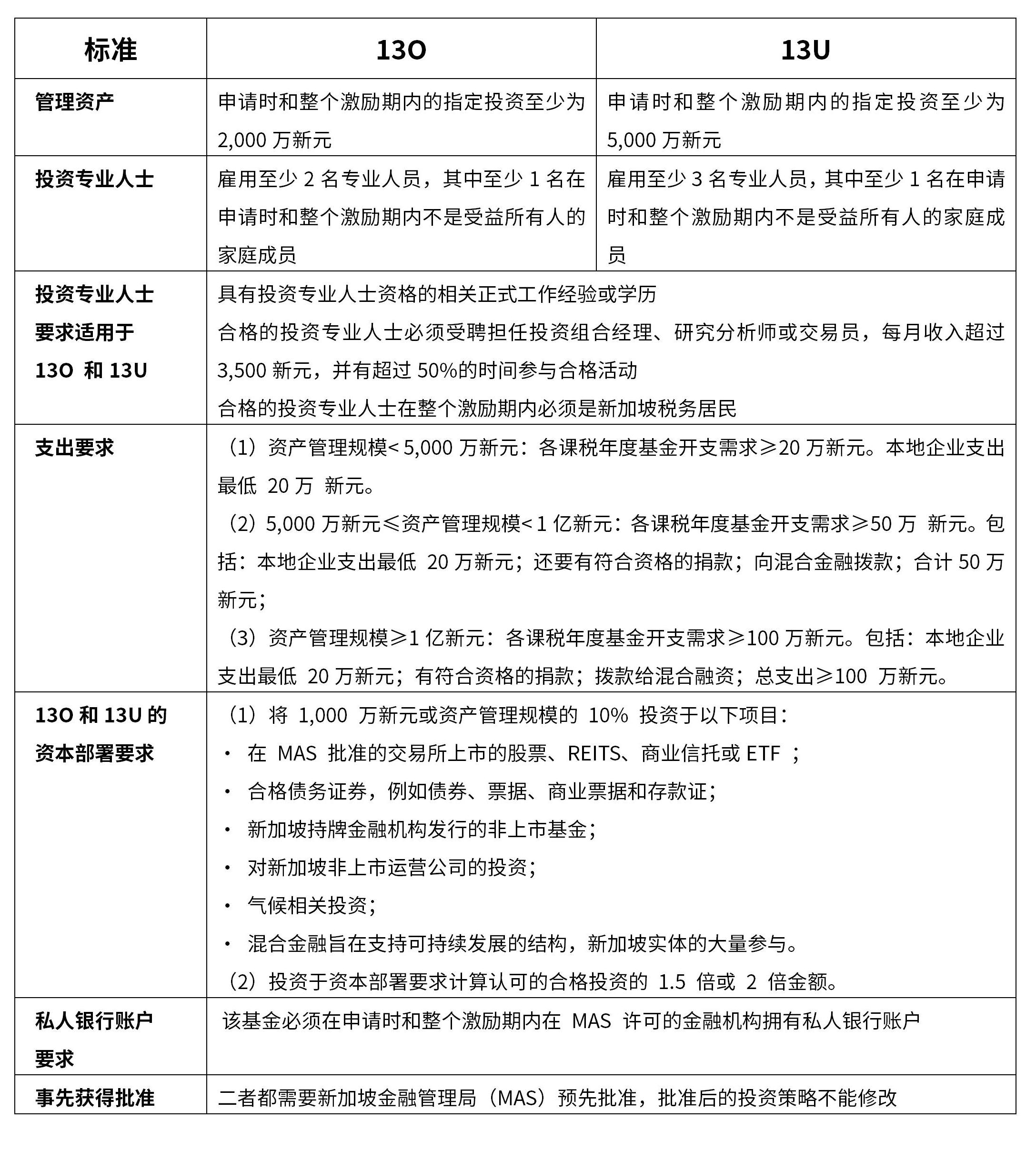 2022年1月1日起,新加坡税务局将13R更名为13O,13X更名为13U。2022年4月11日,新加坡金管局宣布符合13O税收豁免条件的家族办公室门槛翻倍:自4月18日起,13O基金申请时的最低基金规模由此前的500万新元提升为1000万新元,与此同时,基金要承诺在2年的宽限期内将其资产管理规模增加到2000万新元。