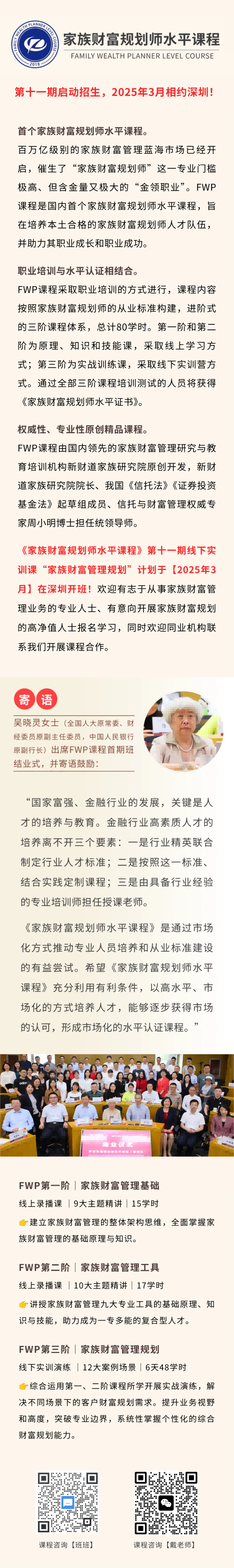 新财道家族研究院总监、家族财富规划师同学会秘书长李岩就《如何构建家族财富管理的系统性思维》的主题与现场嘉宾进行了深入分享。李岩介绍,新财道家族研究院是新财道旗下的研发与培训平台,依托公司的家族服务实践和家族财富规划的专家团队,专注于家族财富管理研究、家族教育课程开发及本土专业人才培养,持续九年深耕本土家族财富管理领域的研究与人才培养实践。新财道家族研究院自主研发的《家族财富规划师水平课程》(FWP课程),由周小明博士担任总设计师及统领导师,是本土家族财富规划师的摇篮。FWP课程将知识技能学习与实战训练相结合、职业培训与水平认证相结合,以其权威性、系统性、专业性和原创性得到学员的广泛认可和好评。FWP课程自2018年首期推出至今,已经为行业培育了200余名优秀的本土家族财富规划师,通过课程的学习助力他们以系统性思维帮助客户构建并实施自己的家族财富管理系统。《家族财富规划师同学会》(FWP同学会)成立于2023年,是历届家族财富规划师在新财道统领组织下成立的自治社群。同学会的使命是使每一位同学成为彼此赋能的贡献者,旨在围绕家族财富管理专业领域为家族财富规划师们搭建建立友谊、资源共享、赋能互助的平台,致力于打造国内家族财富规划领域的优质人才圈层,推动行业内的交流与合作,共同促进家族财富管理事业的发展。