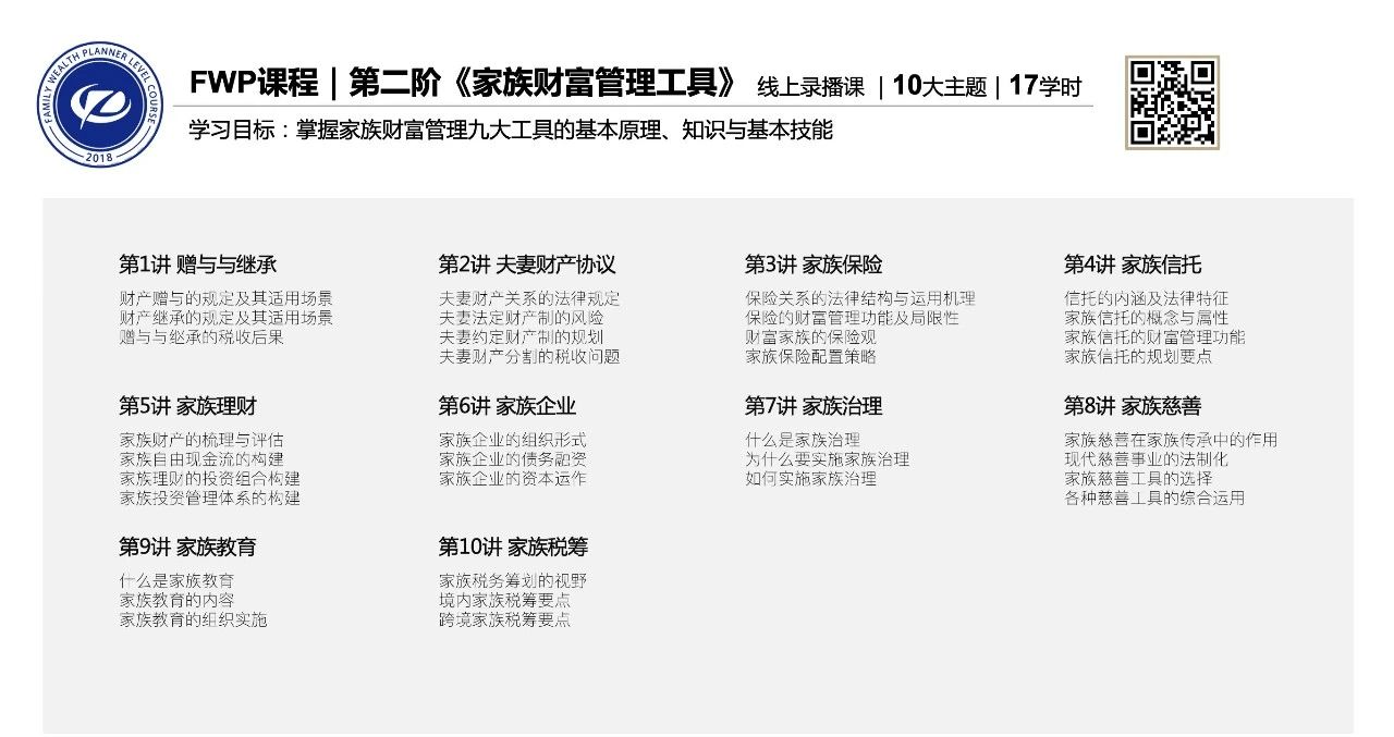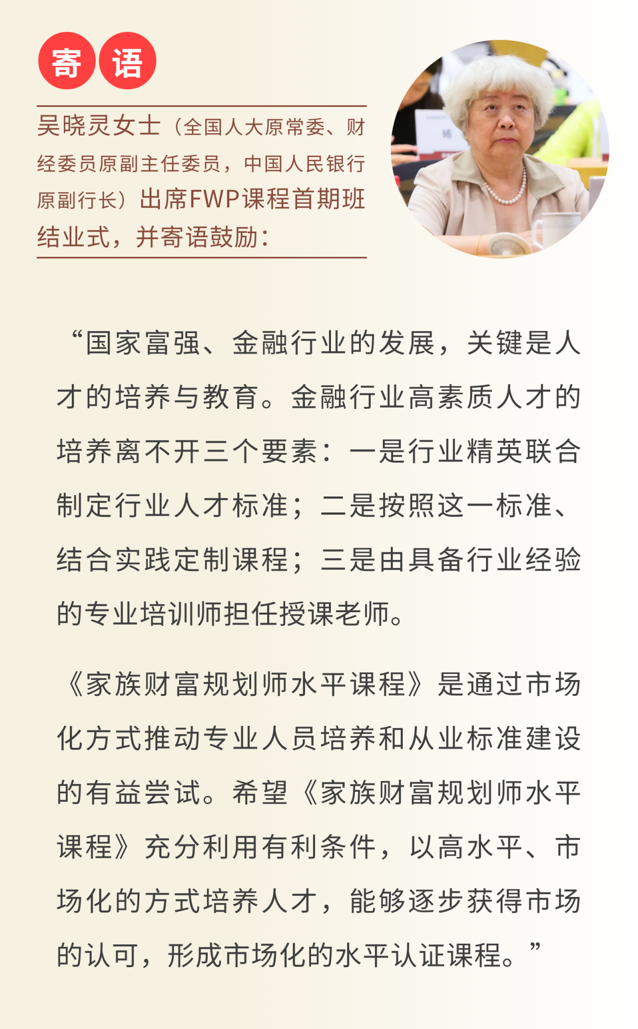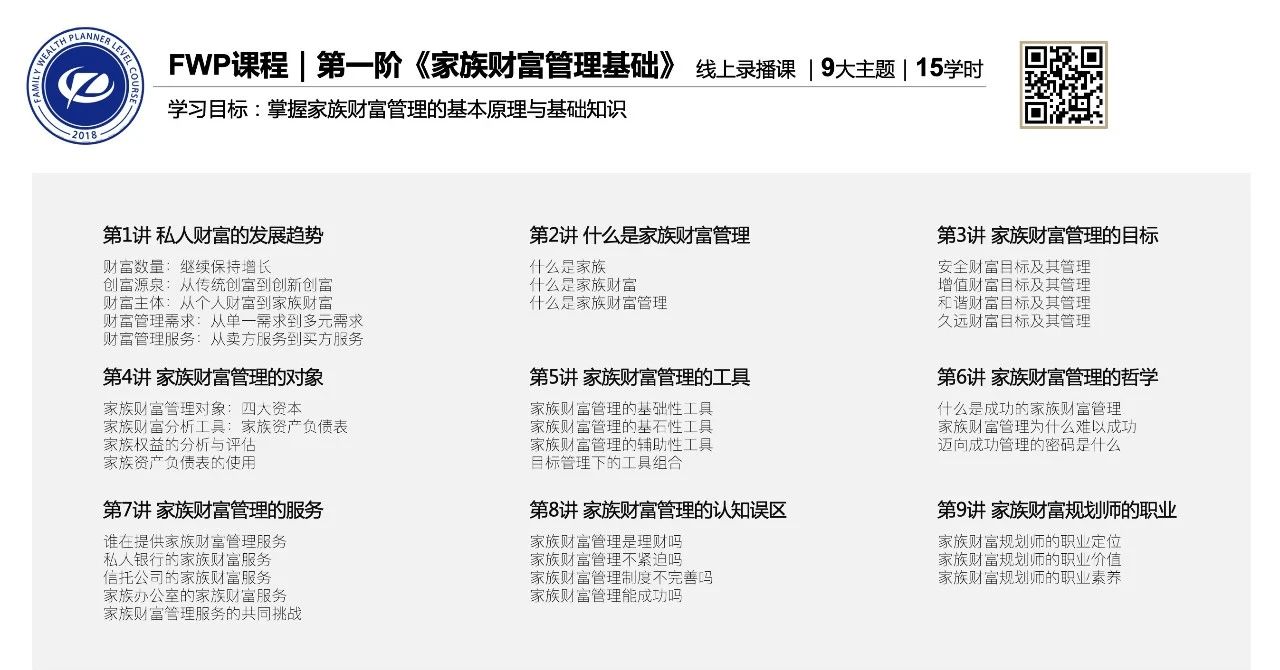 由《中华人民共和国信托法》起草组成员、新财道家族研究院院长、信托与财富管理领域的权威专家周小明博士主持开发并担任统领导师的《家族财富规划师水平课程》(以下简称FWP课程)是国内首个家族财富规划师水平课程,旨在培养本土合格的家族财富规划师人才队伍,并助力其职业成长和职业成功。