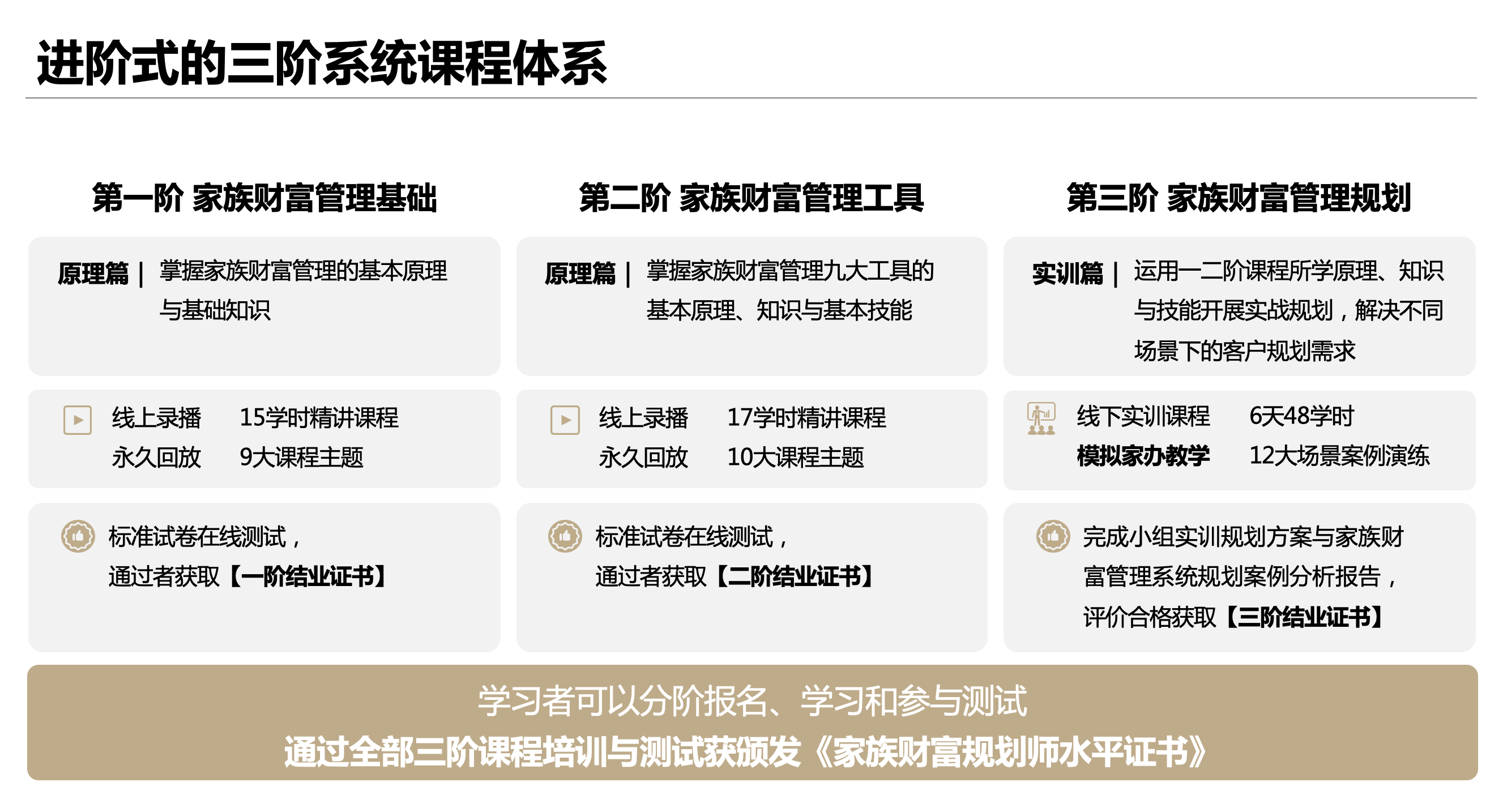 《家族财富规划师水平课程》第三阶“家族财富管理规划”线下实训课持续招生中!历时七年打造,6天实操案例实训,家办顶级规划专家亲授!财富规划师、家办从业者的系统化职业进阶课程!欢迎有志于从事家族财富管理业务和研究的专业人士、有意向开展家族财富规划的高净值人士报名咨询学习,同时欢迎同业机构联系我们开展课程合作。
