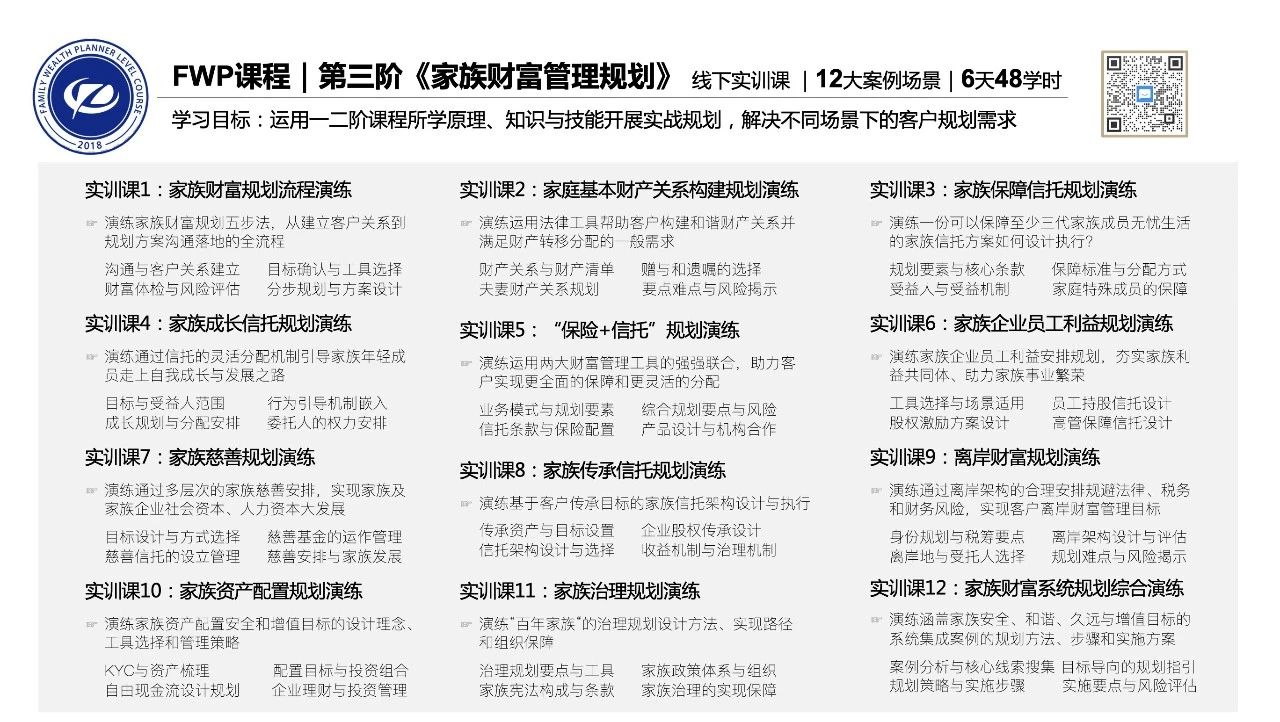 FWP课程第三阶“家族财富管理规划”通过12个具有典型性和多样化场景的家族客户财富规划案例,引导学习者将第一、二阶课程所掌握的核心原理、专业知识与关键技能应用于案例中。通过实战规划演练,帮助学习者深化理解家族财富管理这项工程的复杂性,提升业务视野和高度,突破专业边界,掌握系统化、综合化规划的技能,提高实践中为客户提供个性化、定制化财富规划解决方案的能力。