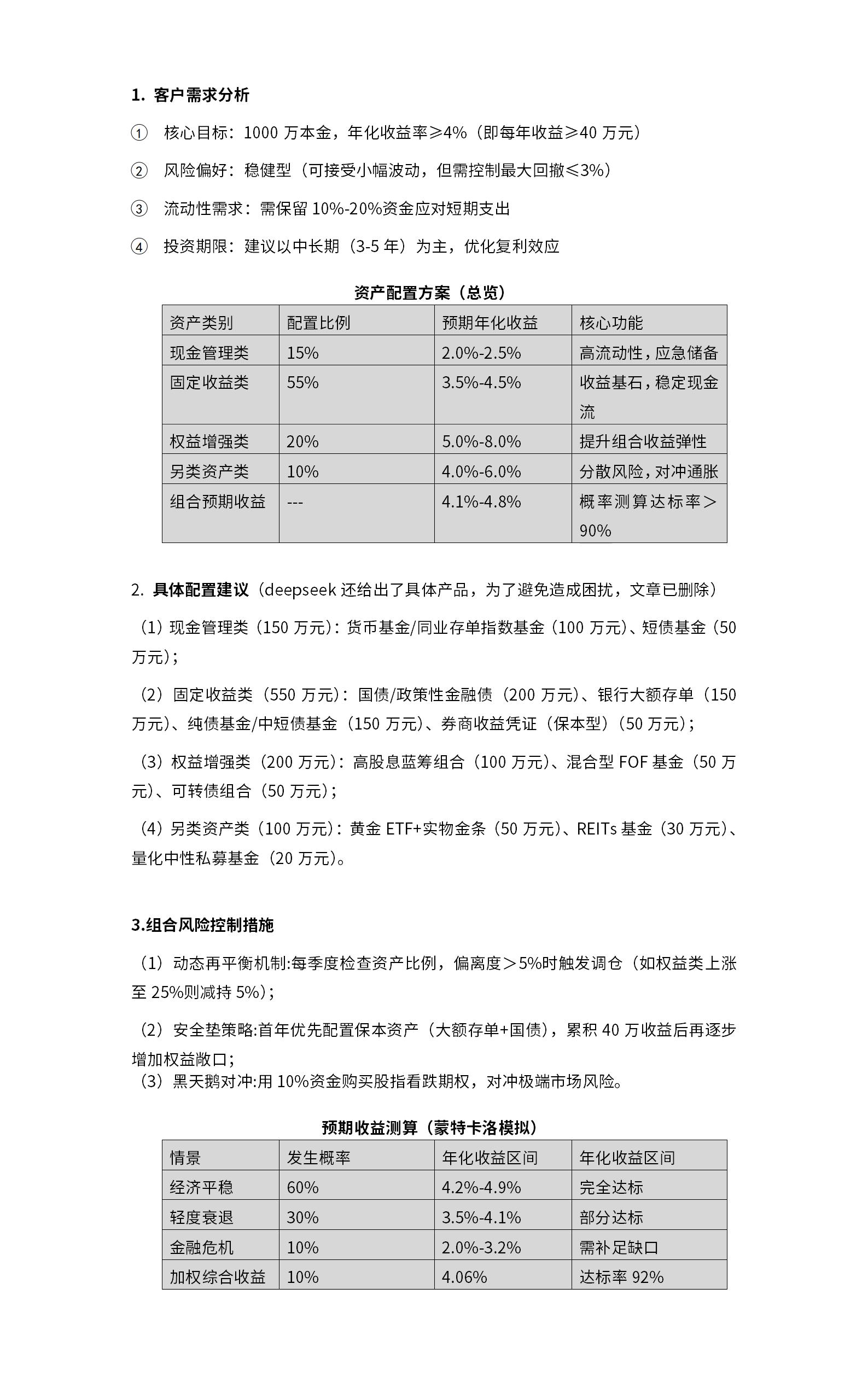 客户有1000万现金,想获得每年4%的收益率,可以配置哪些产品,请给我一份资产配置方案?