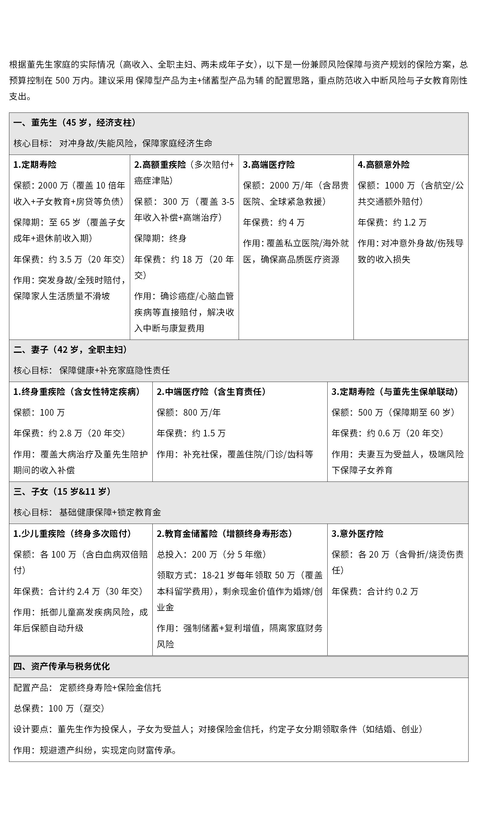 董先生今年45岁,金领,年薪100万;有一儿一女,儿子15岁,初中在读;女儿11岁,在读小学;老婆42岁,全职家庭主妇。董先生计划用500万为家庭成员购买保险,请为董先生的家庭出一份保险规划。