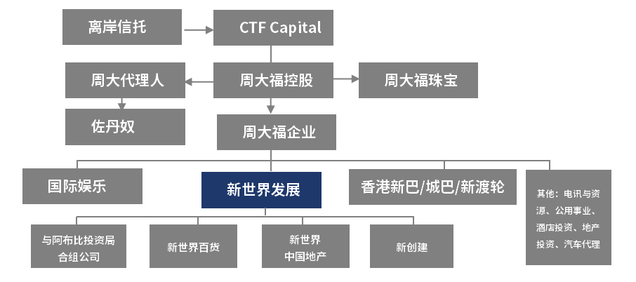 郑裕彤在去世前的一年,即2015年完成了家族企业的所有权和控股权安排。由“周大福控股”直接持有周大福珠宝89.34%的股权,并控制着周大福企业。“周大福控股”的控股股东是“CTF Capital”,郑裕彤家族通过两间离岸公司——Cheng Yu Tung Family Holding(CYTFH)和 Cheng YuTung Family Holding II(CYTFH II),合计持有CTF Capital 95.65% 的股权。