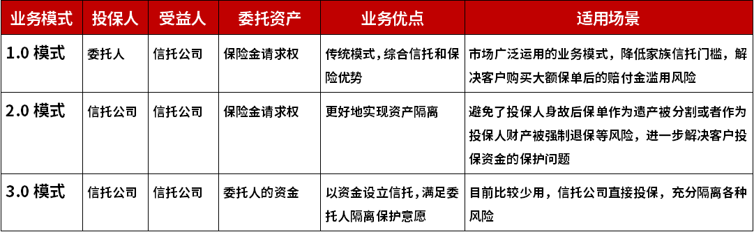 当前国内保险金信托有三种模式,即保险金信托1.0模式、保险金信托2.0模式和保险金信托3.0模式,具体分析见下文。