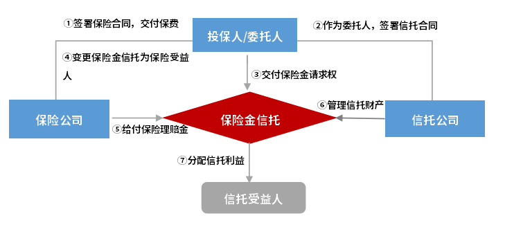 (4)当被保险人身故理赔金、满期保险金给付或生存金返还时,信托公司作为保险受益人申请理赔,保险公司将保险金给付到信托专户;