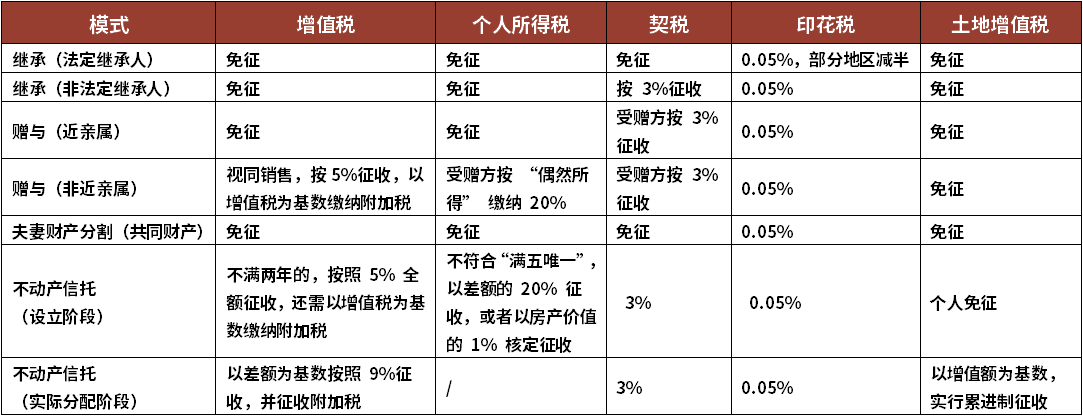 依据上海的《通知》以及北京落地的两单业务,不动产信托的设立、持有和分配/终止仍需按照现行不动产交易或者赠与进行纳税。