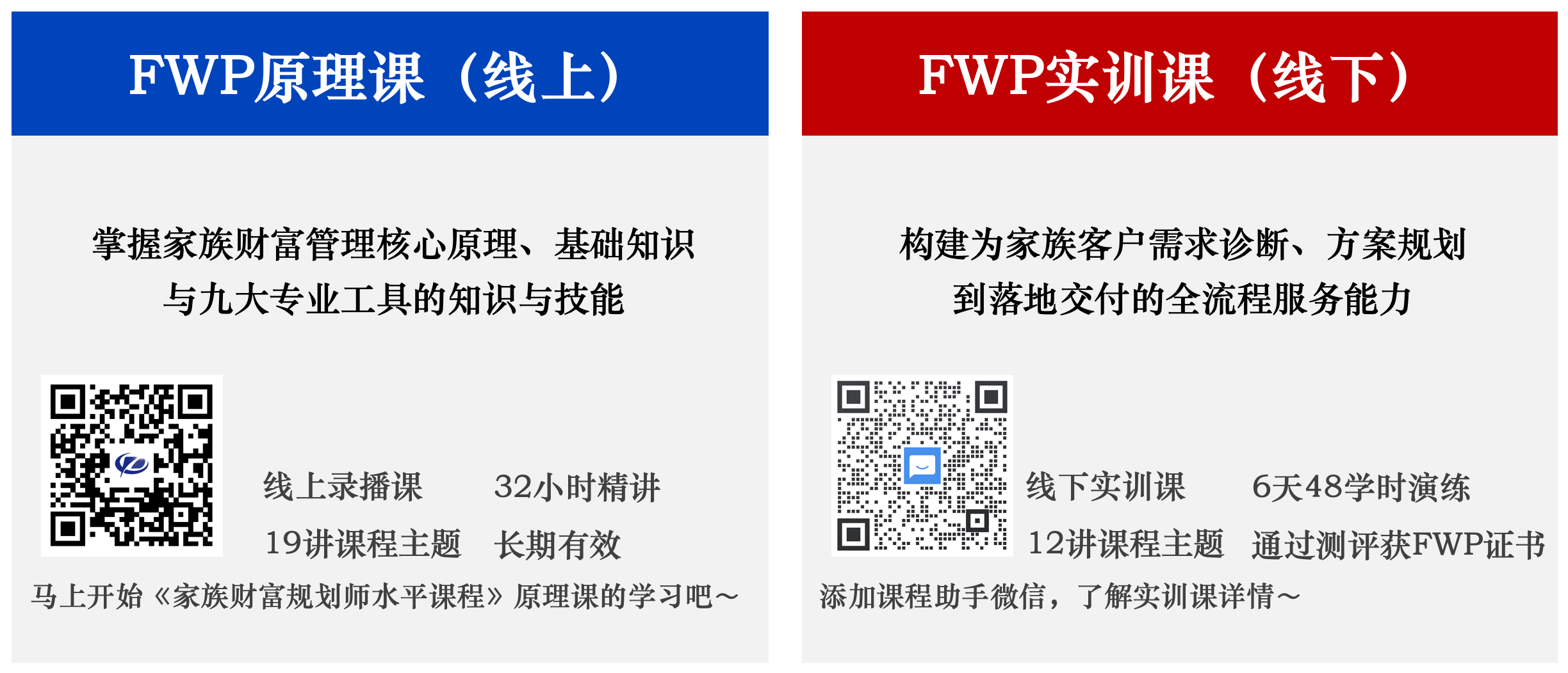 FWP原理课(线上)分为基础篇与工具篇,共19讲主题课程,时长30余小时。原理课系统解构了家族财富管理核心原理与九大专业工具的知识与技能。通过学习能够帮助学员构建家族财富管理认知框架,突破专业壁垒,掌握跨领域工具通识,塑造“一专多能”的复合型人才素养。