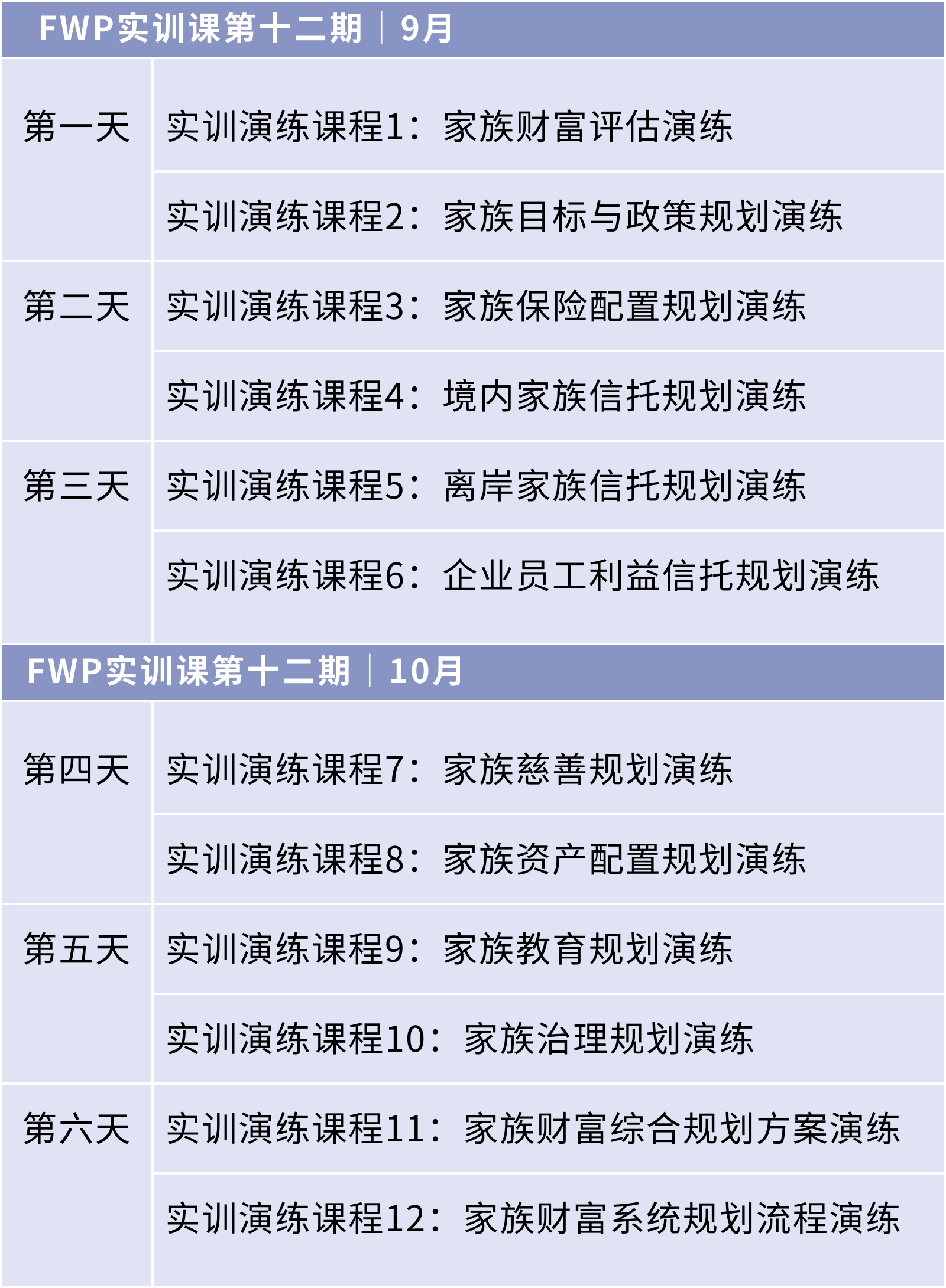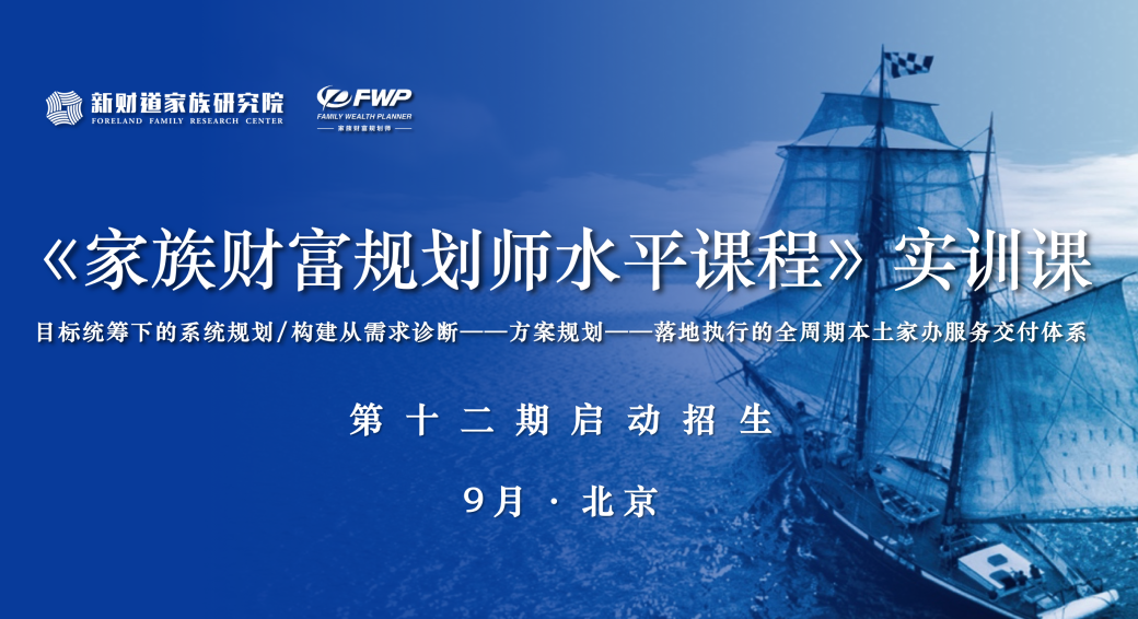 FWP实训课历时八年打造,已迭代升级至3.0版,课程聚焦“服务交付”,旨在帮助学员构建从“需求诊断——方案规划——落地执行”的本土家族办公室服务交付体系与持续的服务能力。FWP实训课第十二期计划于2025年9月开班!欢迎有志于从事家族财富管理业务的专业人士、家族客户报名学习,同时欢迎同业机构联系我们开展课程合作。近年来,我国高净值及超高净值家族的财富传承需求激增,为适应市场需要,帮助家族客户解决家族财富管理难题,培养兼具国际视野与本土经验的家族办公室复合型专业人才,新财道家族研究院结合家族财富管理领域的研究成果及自身家办客户服务经验,于2018年创新性研发并推出国内首个家族财富规划师水平课程。FWP实训课1.0版为9天的全线下实训课程;FWP实训课2.0版为线上原理课与线下实训课结合的三阶进阶制课程。自第十一期班起,FWP实训课进行了3.0版的迭代升级,课程在原知识体系与实训演练的基础上,聚焦“服务交付”,引入全链条家办服务资源,帮助学员在掌握、运用家族财富管理系统规划知识体系的基础上,构建完整的本土家族办公室服务交付体系与持续的服务能力。亮点一:顶层系统规划统领的实训案例与课程结构的全面升级。实训课的场景化案例是源于市场实践,集成了当下具有典型性的客户财富规划需求。课程结构以"目标统筹下的系统规划"服务为核心,从家族财富管理顶层规划思维出发,按照规划流程节点的严密逻辑进行设计,每一讲实训课均为一次基于家族财富管理应用场景的模拟演练。在指导专家的带领下,从家族财富评估、家族目标与政策规划入手,统领九大财富管理工具,完成家族财富管理全流程规划方案的模拟演练。3.0版的FWP实训课聚焦“服务交付”,6天12讲的全课程体系完整涵盖了“家族财富管理综合规划服务”的内容和实施方案,每一讲演练实训课程也对应为一项独立、可落地执行的家办服务项目。学员可以根据自身专业定位,在一线家办专家带领下,通过系统化学习及场景模拟演练,实现将实训成果转化为可收费的家办业务。实训课同时匹配了经新财道评估与筛选的全链条家族办公室服务资源,涵盖家族财富的顶层战略规划资源、保险配置资源、国内与离岸家族信托的受托人服务资源、及境内外资产配置资源等核心家办服务资源。资源提供方全程参与到实训课的教学演练中,通过现场资源的匹配整合,实训课程的演练不再是“纸上谈兵”,而是可交付的包含“真实产品和服务”的家办服务项目规划演练。同时,通过服务资源的匹配也帮助学员构建起自己的家办服务交付体系,为其在实际展业中提供了强有力的资源支撑与专业保障。