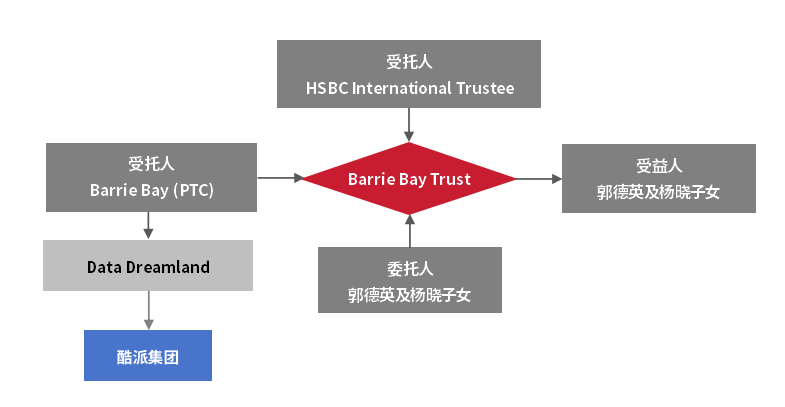 酷派集团2016年披露的增资公告显示,主要股东中,Data Dreamland持股20.15%、乐风持股17.92%,蒋超与李斌分别持股0.59%和 0.40%。其中,作为重要持股主体的Data Dreamland,其全部已发行股本由Barrie Bay (PTC) Limited 持有。Barrie Bay (PTC) Limited作为一家私人信托公司,同时担任 Barrie Bay Trust的受托人。值得关注的是,Barrie Bay Trust是由 HSBC International Trustee Limited (HSBC Trustee)持有的单位信托,HSBC Trustee同样作为该信托的受托人,形成独特的双层受托架构。Barrie Bay Trust是由郭德英与杨晓创立的全权信托,其受益人为郭德英、杨晓及其子女。