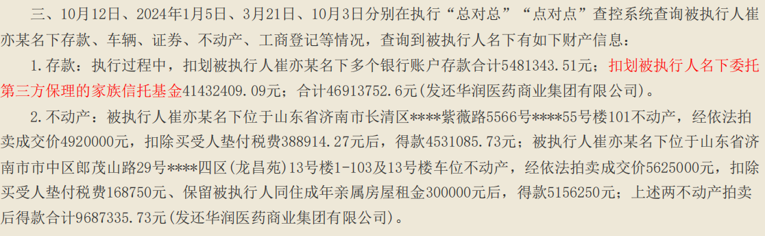 2023年10月,案件进入执行阶段,南通崇川法院迅速展开行动。执行法官借助“总对总”查控系统,对崔亦某的财产展开了全面细致的调查,并成功扣划其名下多个银行账户存款共计548.13万元,同时将崔亦某名下价值 4143万元的家族信托资产当作存款强制执行,合计4691.38万元发还华润医药商业集团有限公司。