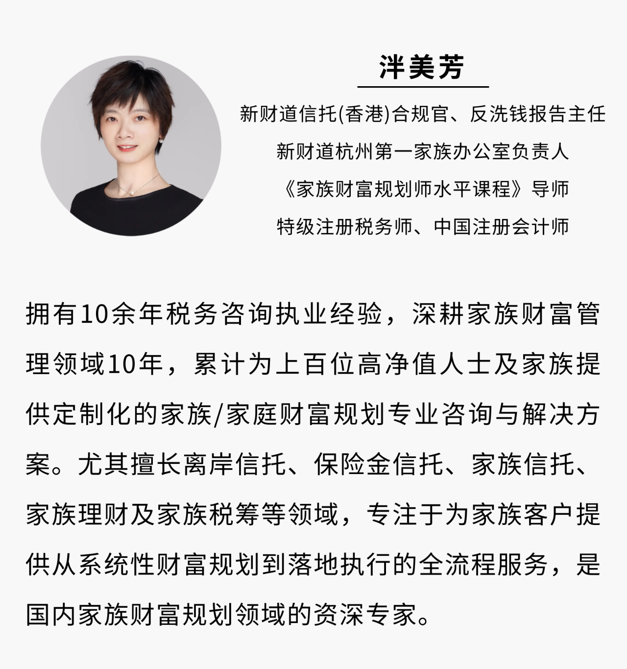 本次沙龙以家族财富的离岸规划与全球资产配置的税务合规要略为主题,泮美芳结合自身的专业背景与丰富的实践经验,围绕离岸财富规划领域新趋势、避坑指南与核心要点,以及全球资产配置税务合规关键要素、香港信托独特优势等核心议题展开交流与探讨。
