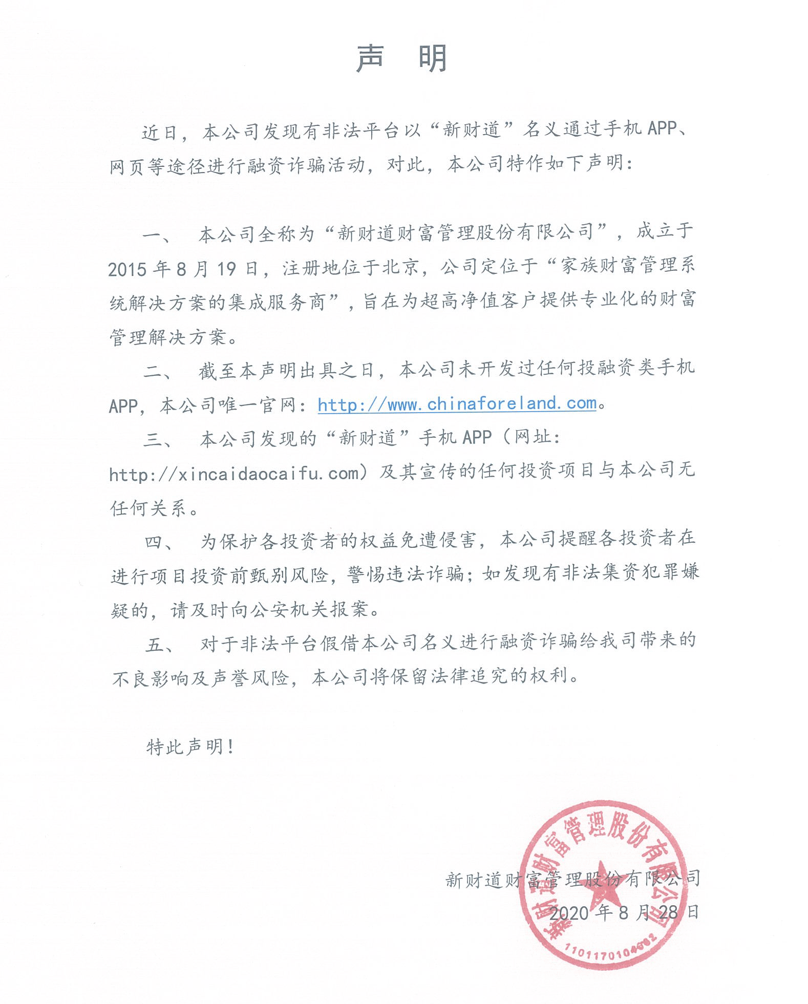 近日,本公司发现有非法平台以“新财道”名义通过手机APP、网页等途径进行融资诈骗活动,对此,本公司特作如下声明: