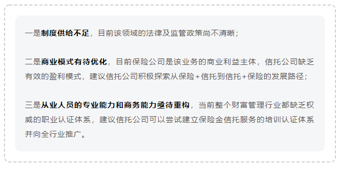周小明博士表示,保险金信托是一项非常好的金融服务,它是信托回归本源业务的体现,弥补了保险本身很难周全保护受益人的不足,为家庭形成了更完整的保障链。但保险金信托业务发展面临几方面挑战: