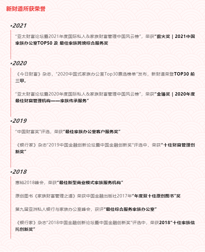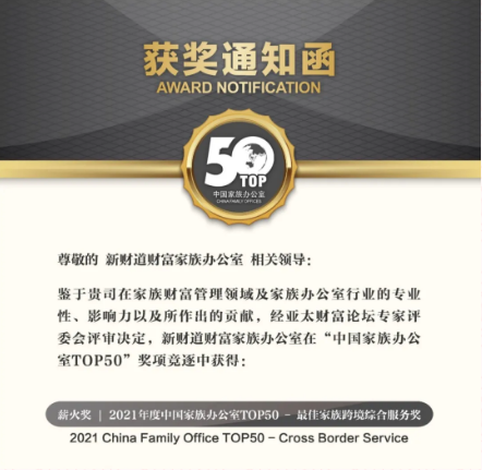 新财道凭借优质的一站式家办服务、良好的客户体验、高度的客户信任以及领先的专业能力,入选中国家族办公室TOP50,尤其突出的协同全球的整合能力,更使我们荣幸摘得“最佳家族跨境综合服务奖”。这是举办方对新财道领先专业能力与贴心服务能力的高度认可。不仅如此,经过六年多的锻造,新财道在家族财富与传承规划、家族事务与家族企业规划、家族治理与文化传承等各领域的服务模式、服务产品及创新能力,均已获得各界广泛认可。