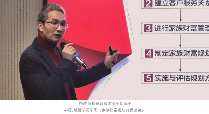 《家族财富规划师水平课程》(FWP课程)是国内首个家族财富规划师水平课程,由新财道家族研究院院长、《信托法》起草组成员、著名的财富管理专家周小明博士主持开发并担任统领导师,旨在培养本土合格的家族财富规划师人才队伍,并助力其职业成长和职业成功。