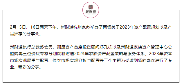 2月15日、16日两天下午,新财道杭州家办举办了两场关于2023年资产配置规划以及产品推荐的分享会。