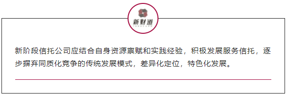 新阶段信托公司应结合自身资源禀赋和实践经验,积极发展服务信托,逐步摒弃同质化竞争的传统发展模式,差异化定位,特色化发展。