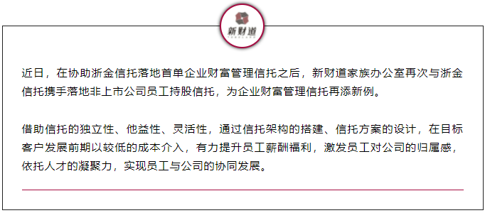 近日,在协助浙金信托落地首单企业财富管理信托之后,新财道家族办公室再次与浙金信托携手落地非上市公司员工持股信托,为企业财富管理信托再添新例。 借助信托的独立性、他益性、灵活性,通过信托架构的搭建、信托方案的设计,在目标客户发展前期以较低的成本介入,有力提升员工薪酬福利,激发员工对公司的归属感,依托人才的凝聚力,实现员工与公司的协同发展。