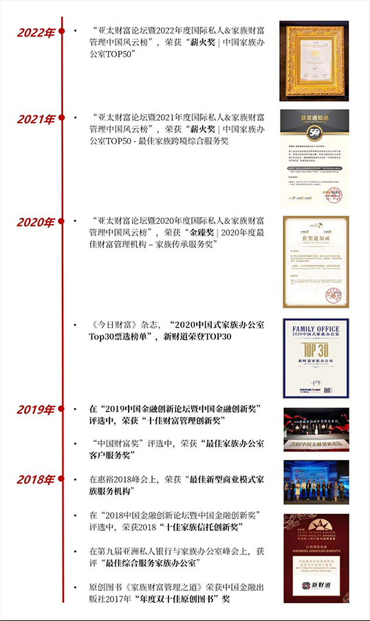 新财道曾获得“十佳家族信托管理创新奖”、“家族传承服务奖”、“最佳家族跨境综合服务奖”等荣誉和称号。