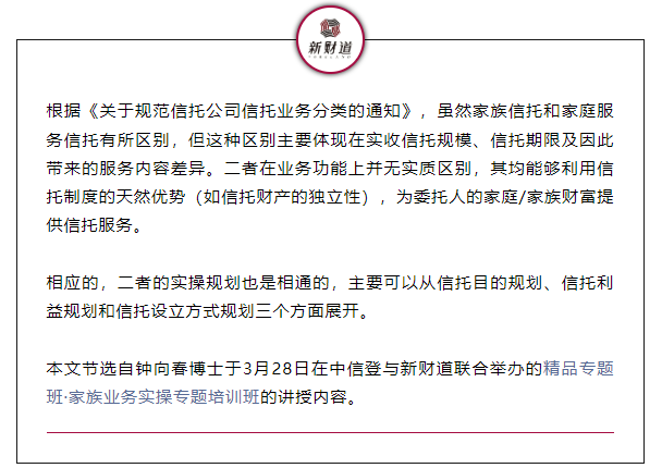 ……(未完,更多内容请点击链接查看:专家谈 | 信托三分类背景下家族/家庭服务信托实操规划要点)