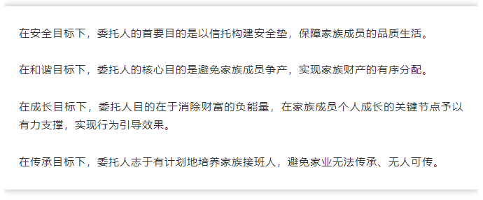 家族目标,也就是家族需求,往往决定了信托目的,并为整个家族/家庭服务信托的规划奠定了基调。家族目标通常可以分为安全目标、和谐目标、成长目标和传承目标。