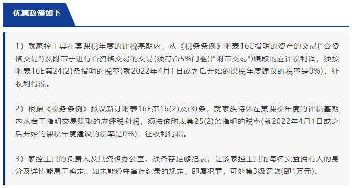 2023年5月10日,香港立法会正式通过了《2022年税务(修订)(家族投资控权的税务宽减)条例草案》,为单一家族办公室所管理的具资格家控工具提供税务宽减。条例指出,虽然每个家族办公室的机构不仅相同,一般而言,家族会设立投资控股工具(“FIHV”)以持有家族资产,及设立另一个单独实体(即单一家族办公室)以管理由家控工具所持有的资产,相关的投资收益一般属于家控工具。家控工具亦会设立特定目的实体(“FSPE”“家族特体”)以持有和管理家控工具的资产。