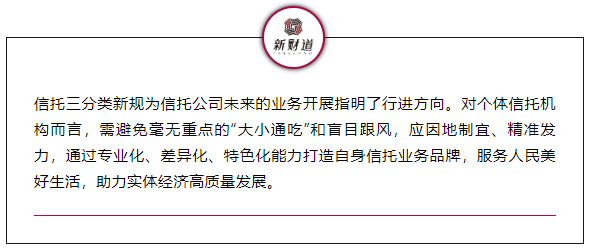 信托三分类新规为信托公司未来的业务开展指明了行进方向。对个体信托机构而言,需避免毫无重点的“大小通吃”和盲目跟风,应因地制宜、精准发力,通过专业化、差异化、特色化能力打造自身信托业务品牌,服务人民美好生活,助力实体经济高质量发展。