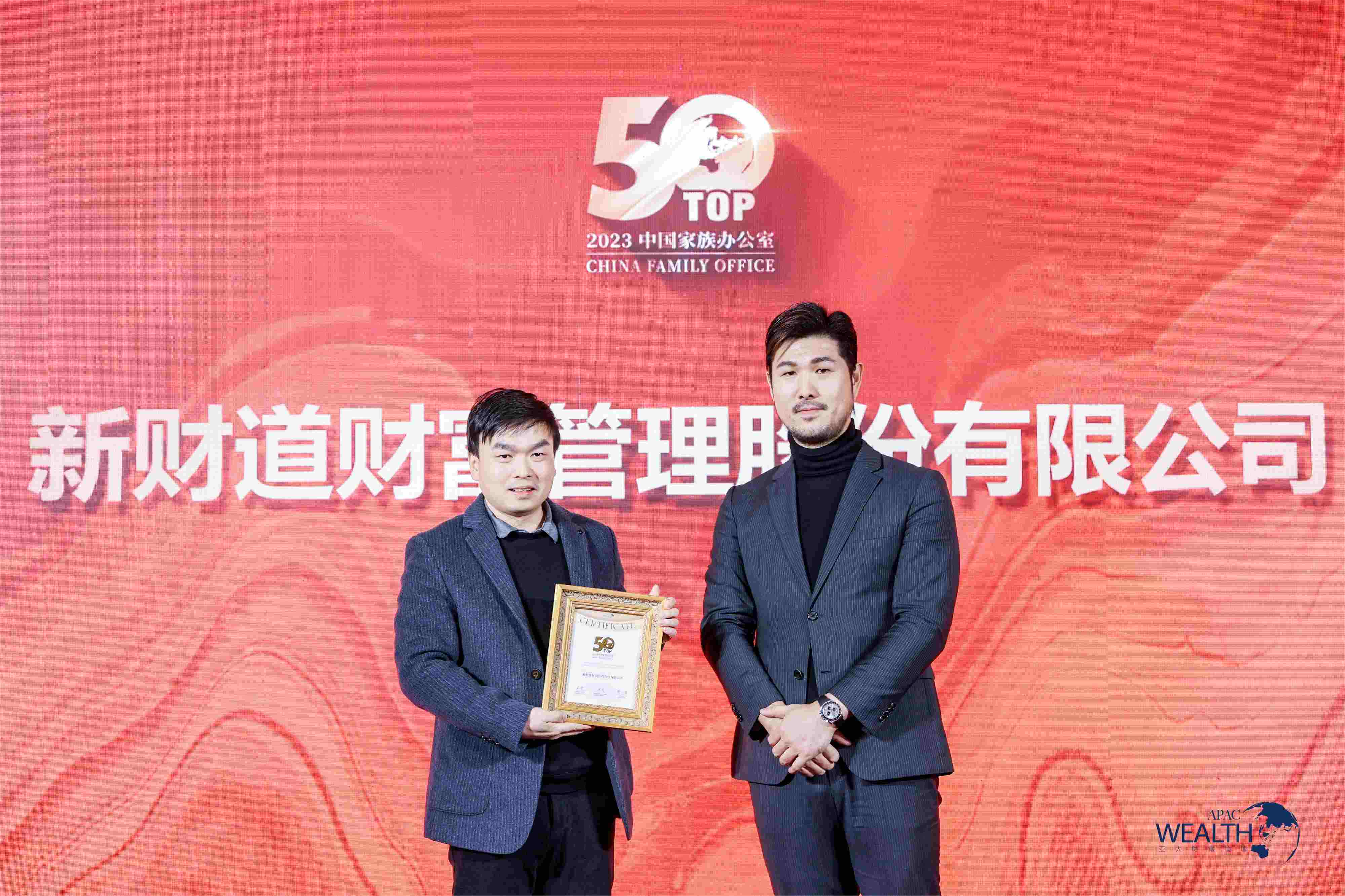 2023年12月22日,新财道受邀出席由《财富管理》杂志及财策智库主办的第八届亚太财富论坛暨2023年度国际私人及家族财富管理行业颁奖盛典。新财道从众多申报机构中脱颖而出,斩获“薪火奖 | 2023年度中国家族办公室TOP50”。
