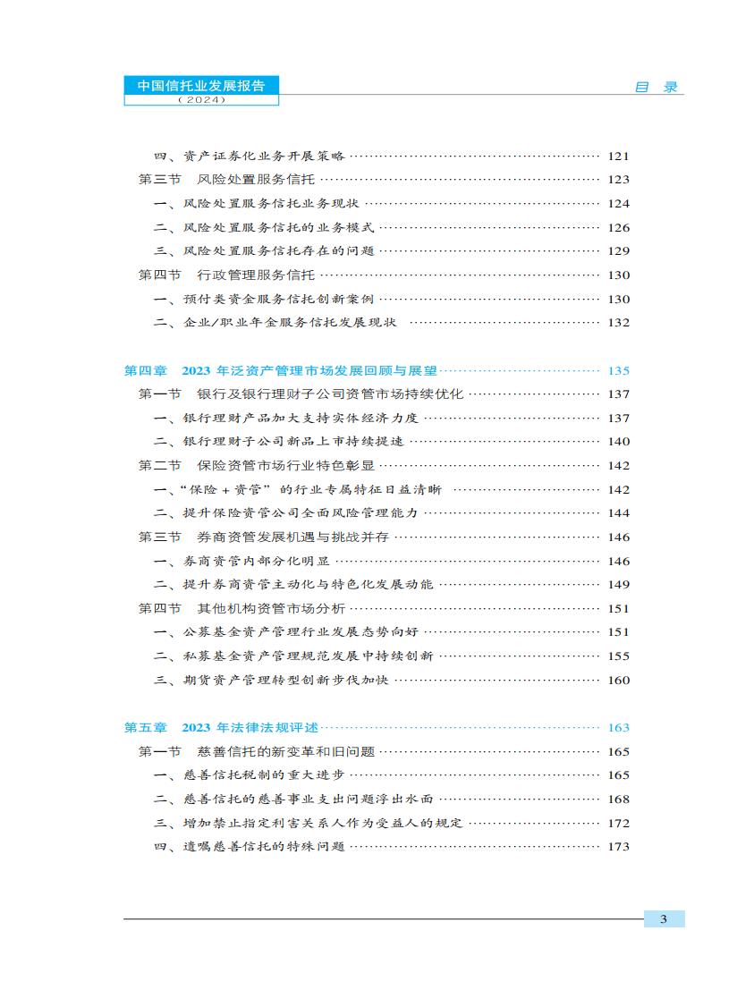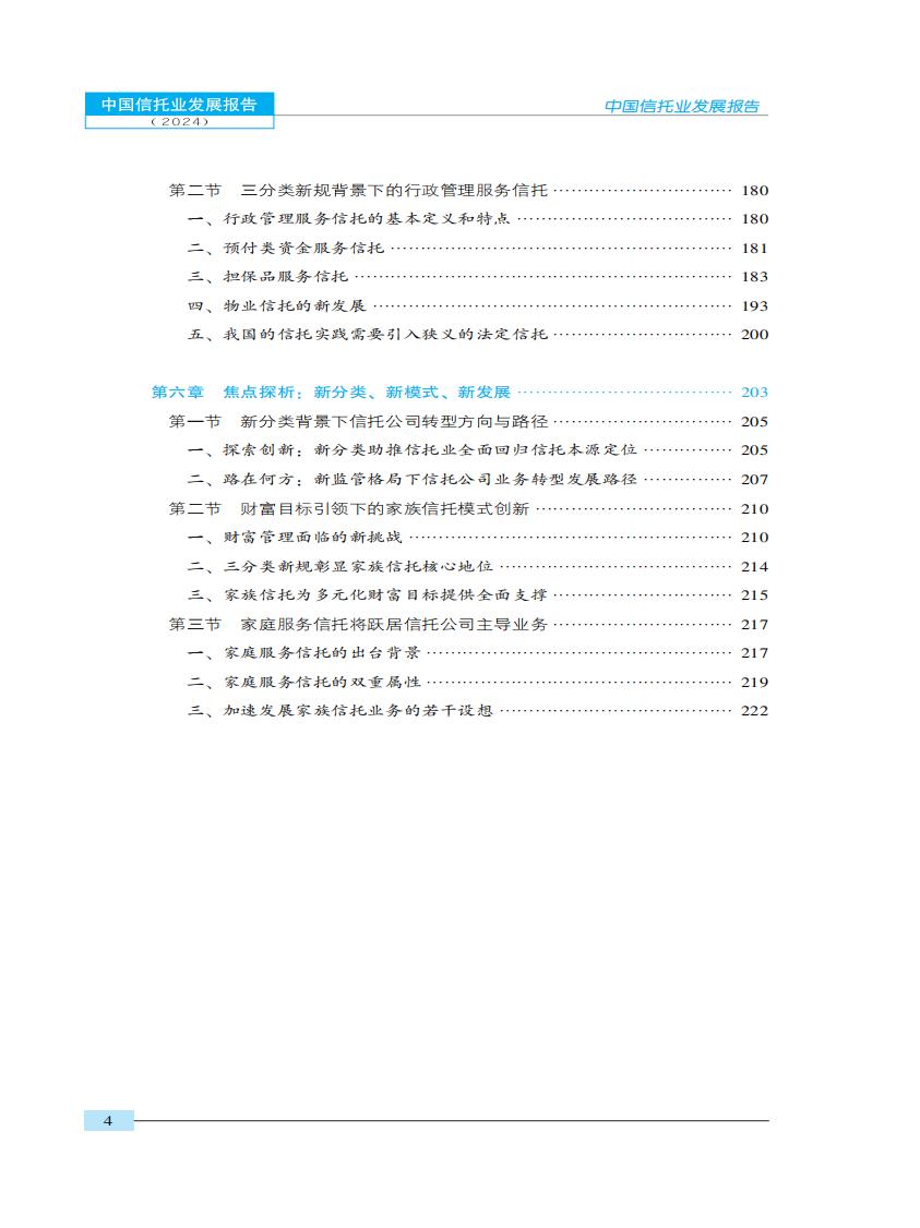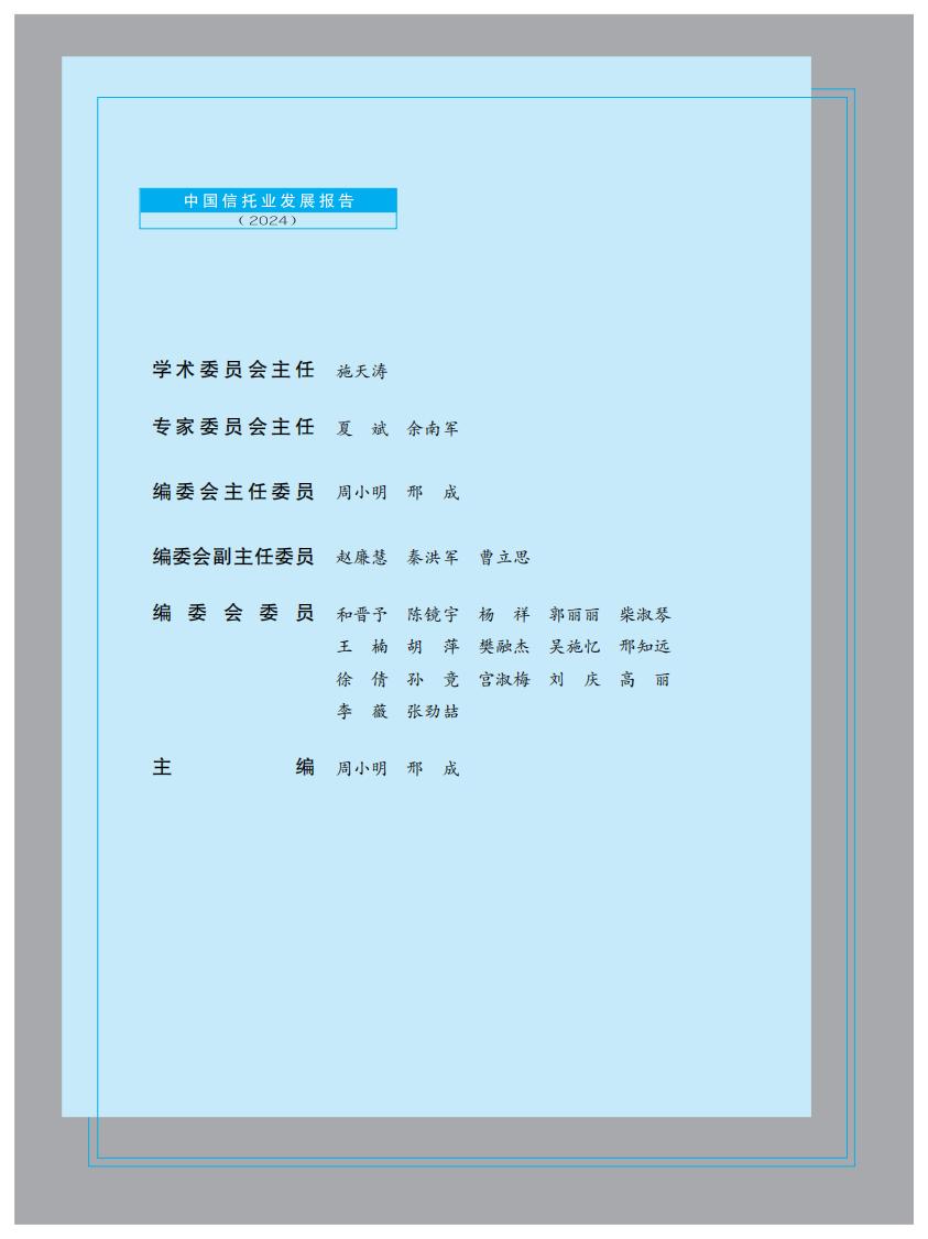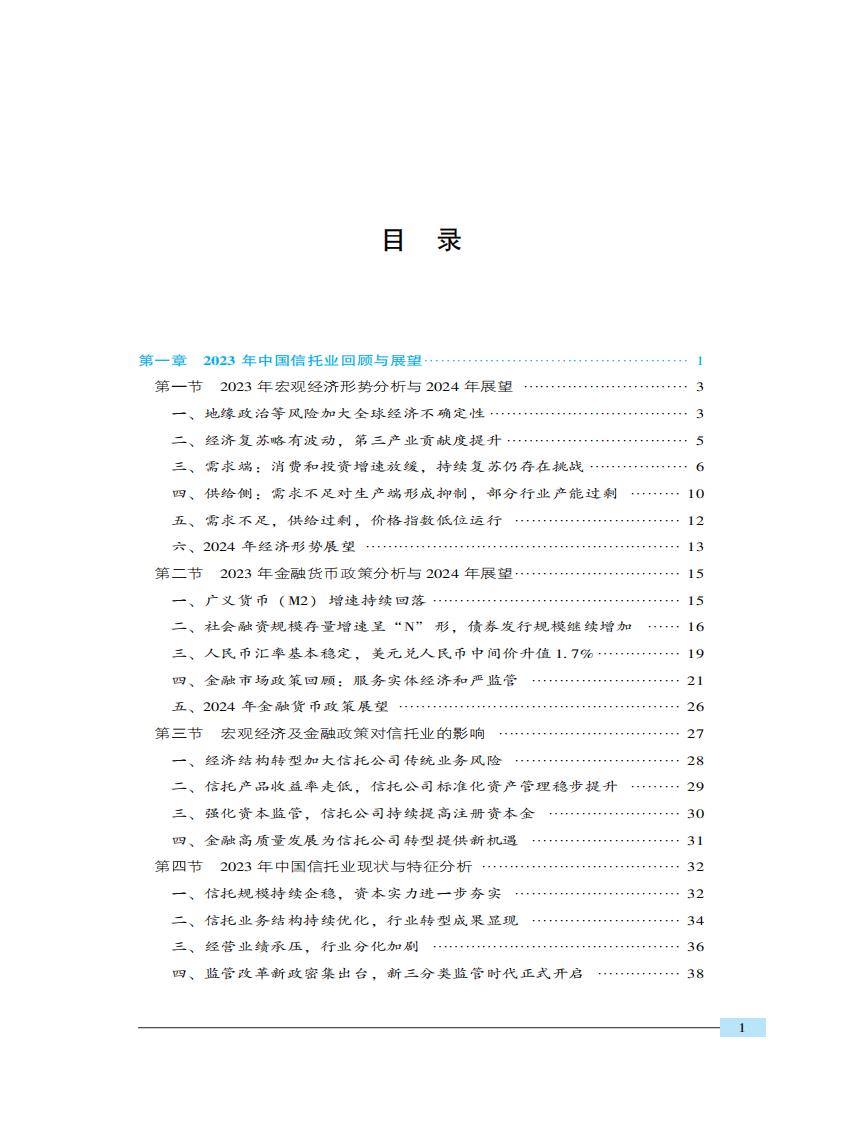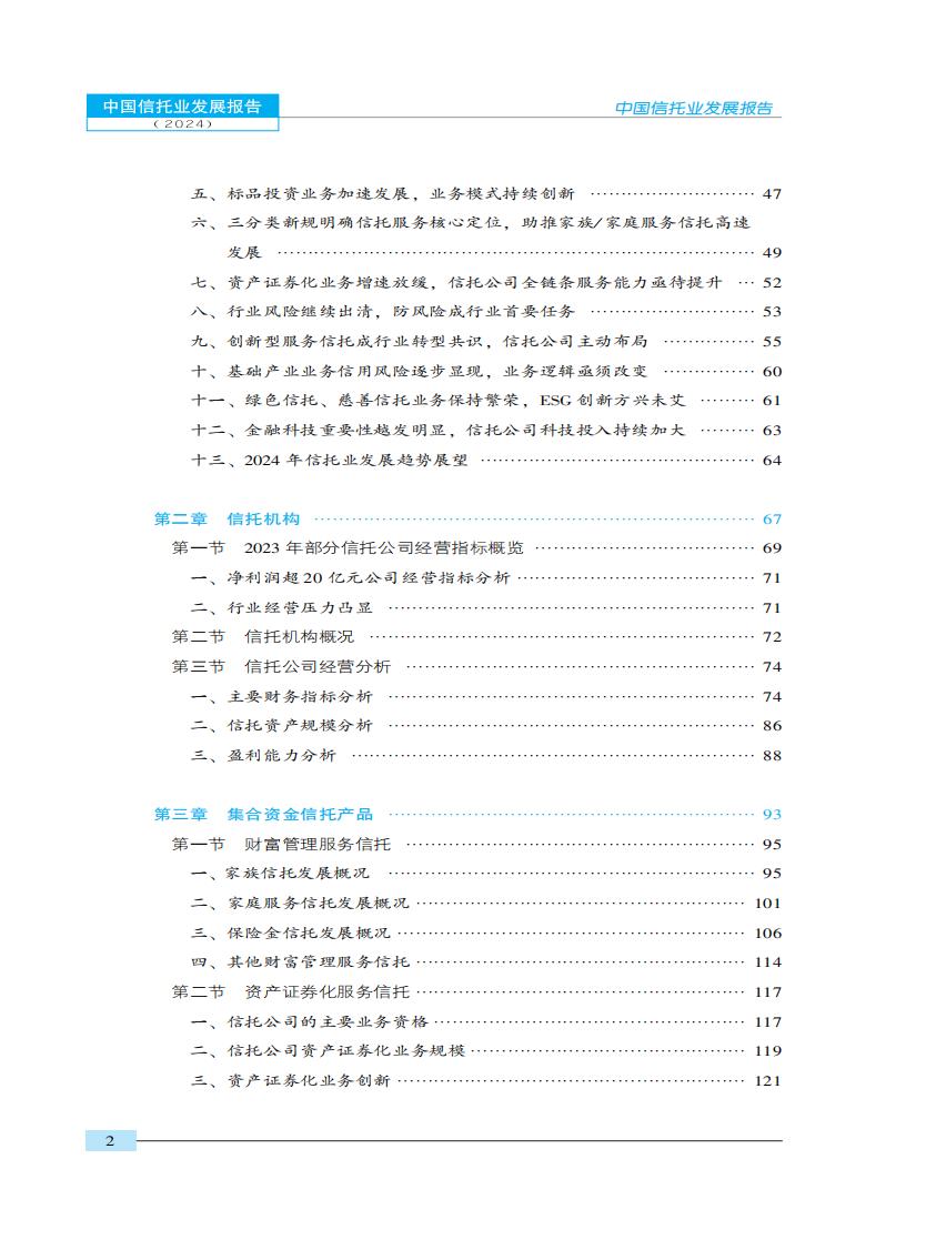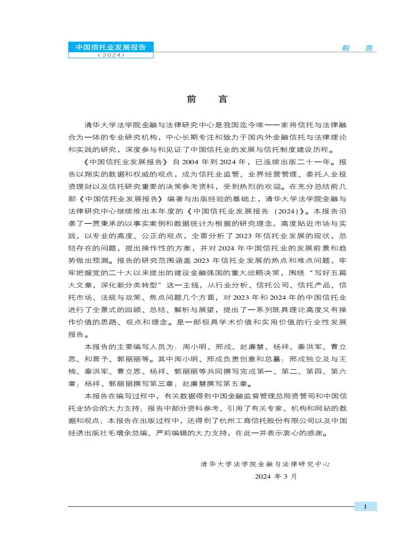 本报告沿袭了一贯秉承的以事实案例和数据统计为根据的研究理念,高度贴近市场与实 践,以专业的高度、公正的观点,全面分析了2023年信托业发展的现状,总结存在的问题, 提出操作性的方案,并对2024年中国信托业的发展前景和趋势做出预测。报告的研究范围涵盖2023年信托业发展的热点和难点问题,牢牢把握党的二十大以来提出的建设金融强国的重大战略决策,围绕“写好五篇大文章,深化新分类转型”这一主线,从行业分析、信托公司、信托产品、信托市场、法规与政策、焦点问题几个方面,对2023年和2024年的中国信托业进行了全景式的回顾、总结、解析与展望,提出了一系列既具理论高度又有操作价值的思路、观点和理念。是一部极具学术价值和实用价值的行业性发展报告。
